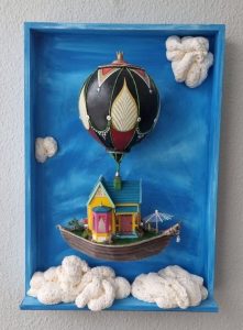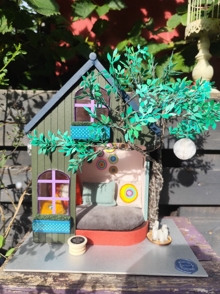 Hergestellt aus Pappe, Sperrholz, Papier, Aquarellefarben, Quilling Papierstreifen, Holzleim, Deko Mini Ballon, Draht, Geburtstagskerzen, Astscheibe, Stoffe, Füllwatte, Holringe, Aufkleber, Plexiglas, Washi Tape, Modellbau Pflanzen, Heißkleber, Aquarellpapier