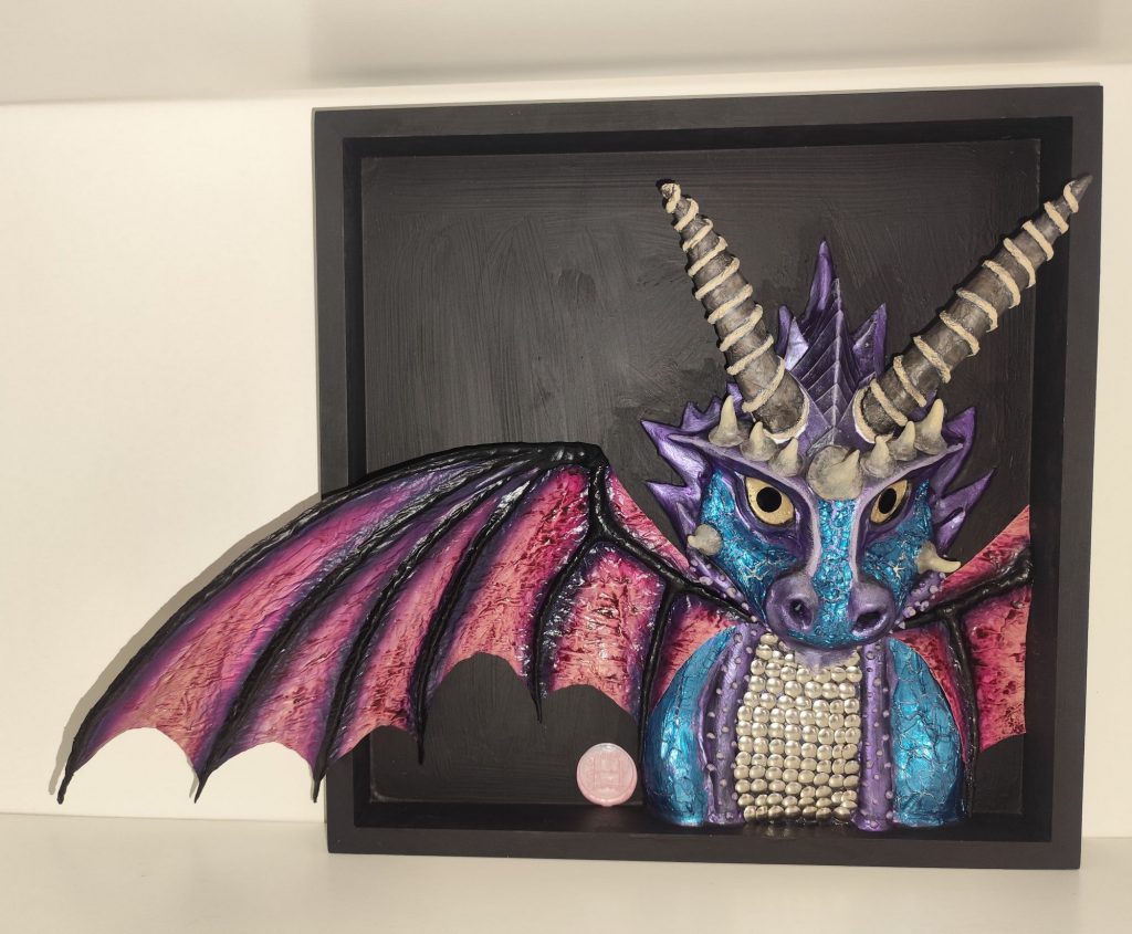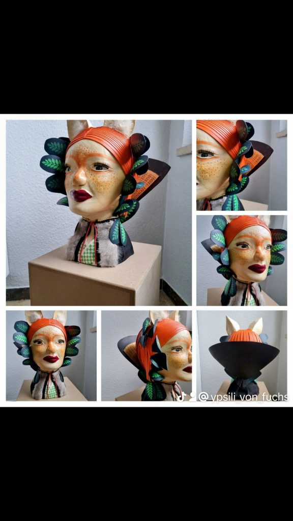 Hergestellt aus Draht, Pappmaché, Cracklepaste, Butterbrotapapier, Acrylfarbe, Klarlack, Holzleim, Epoxidharz, Heftzwecken, polyclay, Heißkleber,