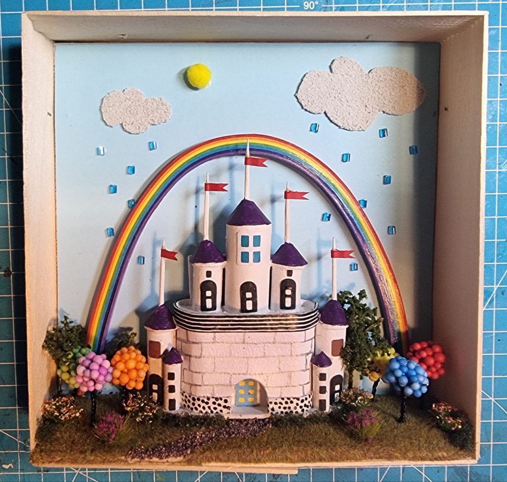 Hergestellt aus Bauschaum, Acrylfarbe, Holzleim, Pappmaché, Klebeperlen, Coctailschirm, Perlen, Papier, Pappe, Sperrholz, Warhammer Figur, Folie, Schnüre, Streurasen aus dem Modellbau, kleine Blumen aus dem Modellbau, Sträucher aus dem Modellbau, Zahnstocher, Kaffeerührstäbchen Dekokrone