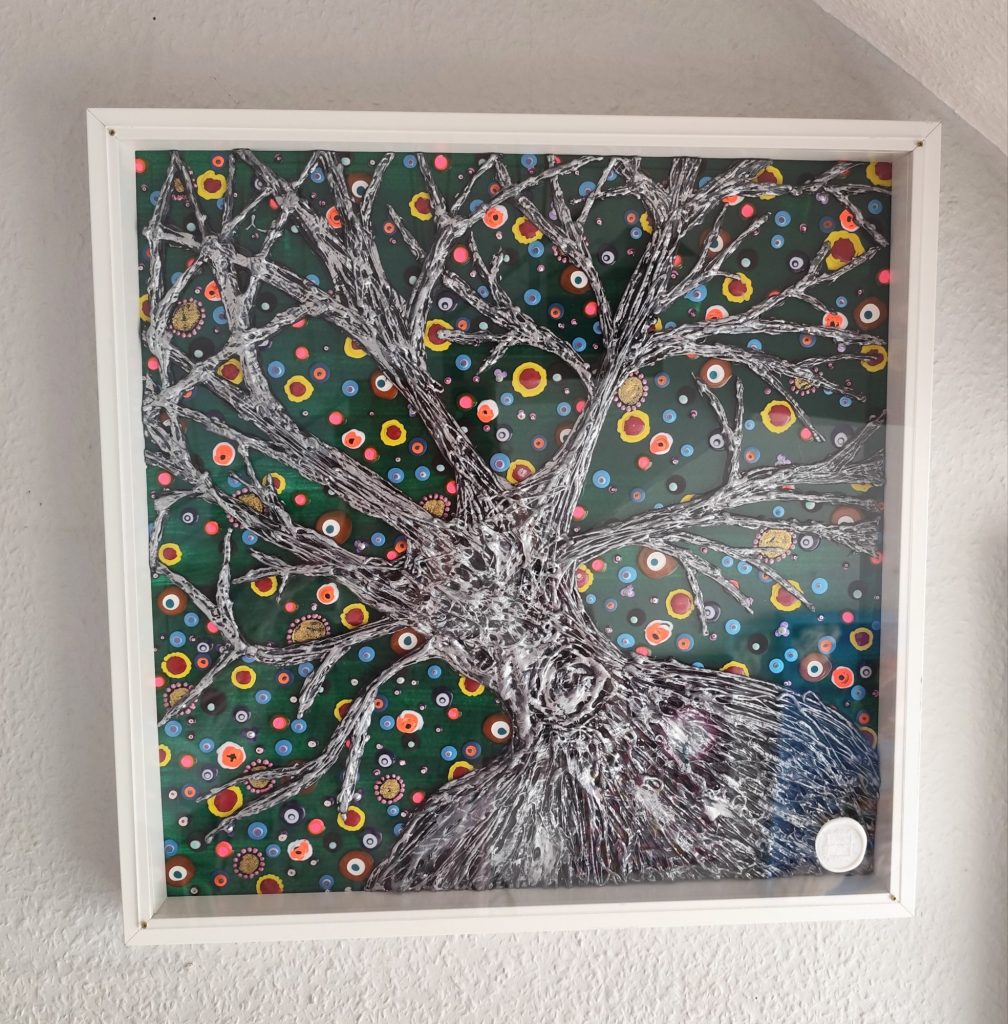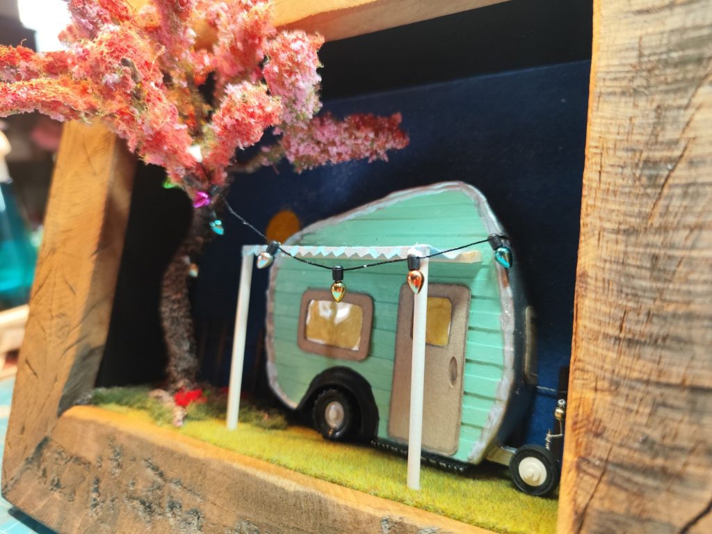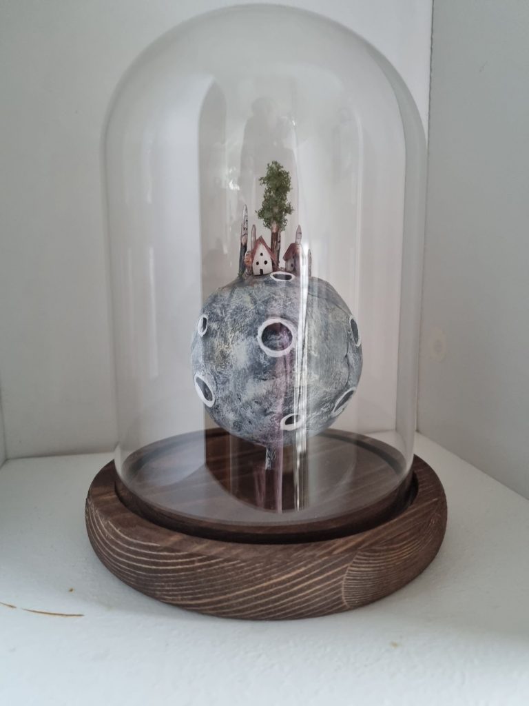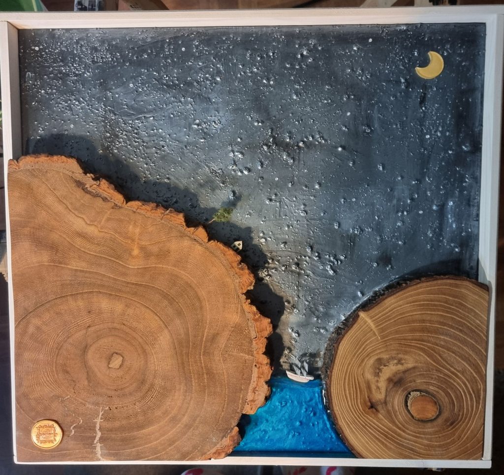 Hergestellt aus Holzscheiben, Epoxidharz, Metallicpulver und Alkoholtinte, Holz, Papier, Holzleim, kleine Steine, Acrylfarbe, Draht, Beflockung vom Modellbau,