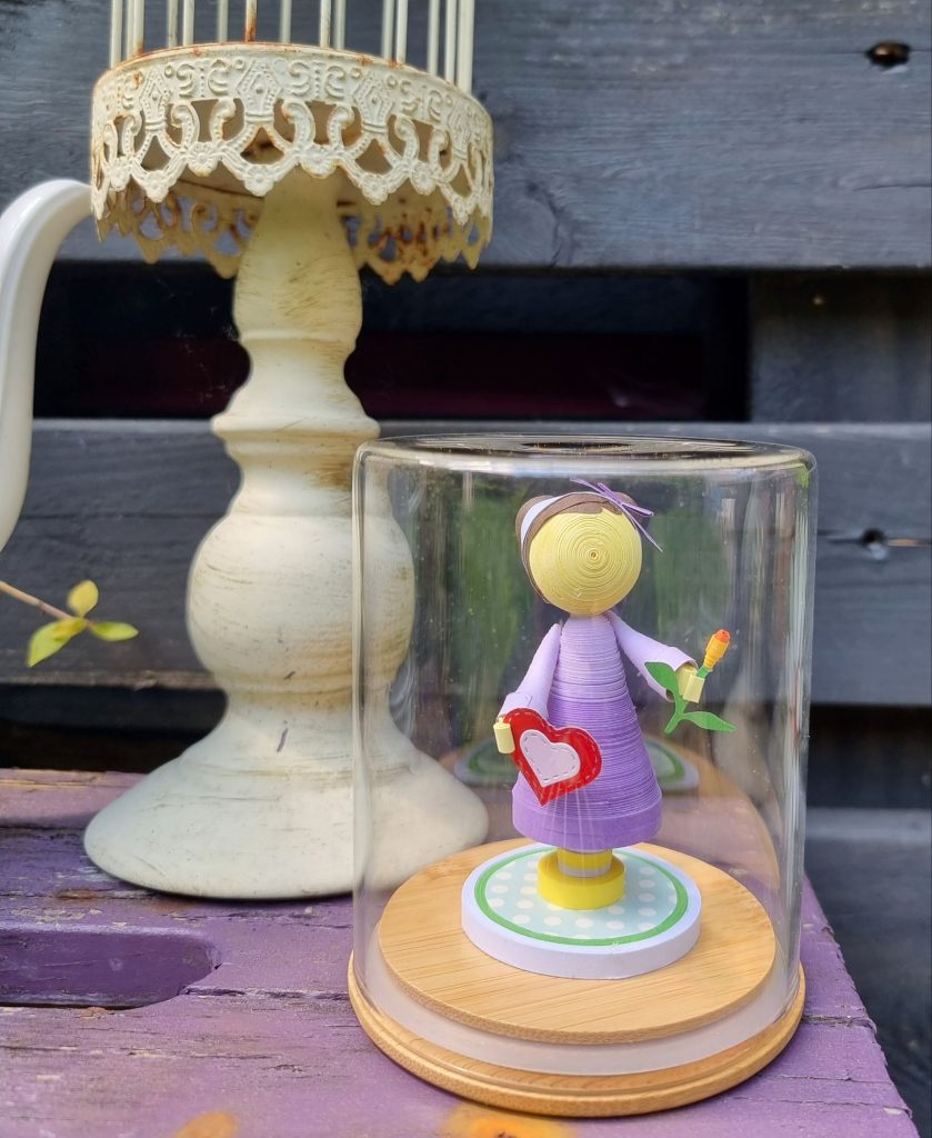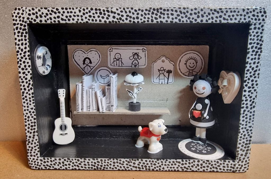 Hergestellt aus Pappe, Papier, Washi Tape, Quilling Papierstreifen, Zahnstocher, Styropurkugeln, Beflockung aus dem Modellbau, Holzleim, kleine Steinchen, Schmelzgranulat, Acrylfarbe