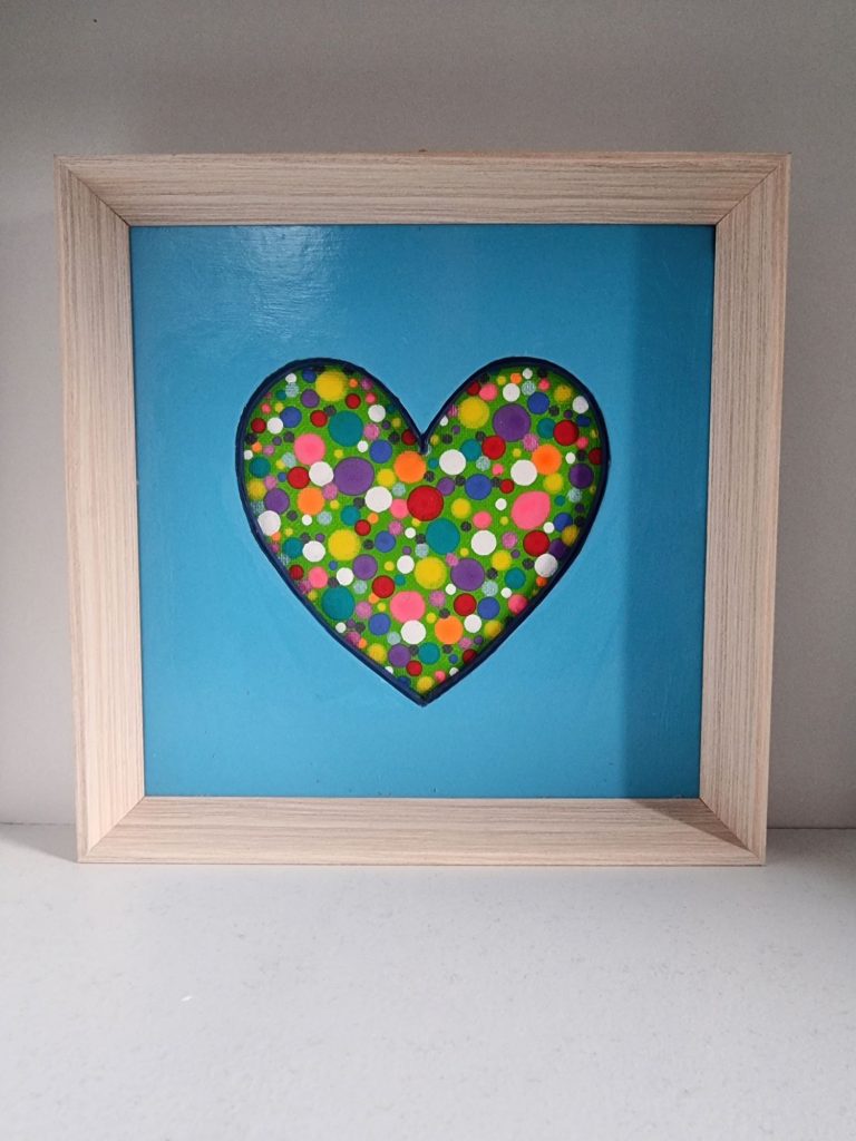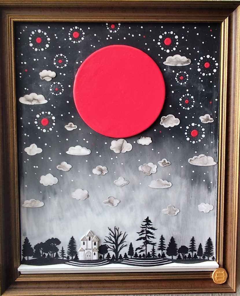 Hergestellt aus Acrylfarbe, Holzleim, Sand, kleine Steine, Quillingpapierstreifen