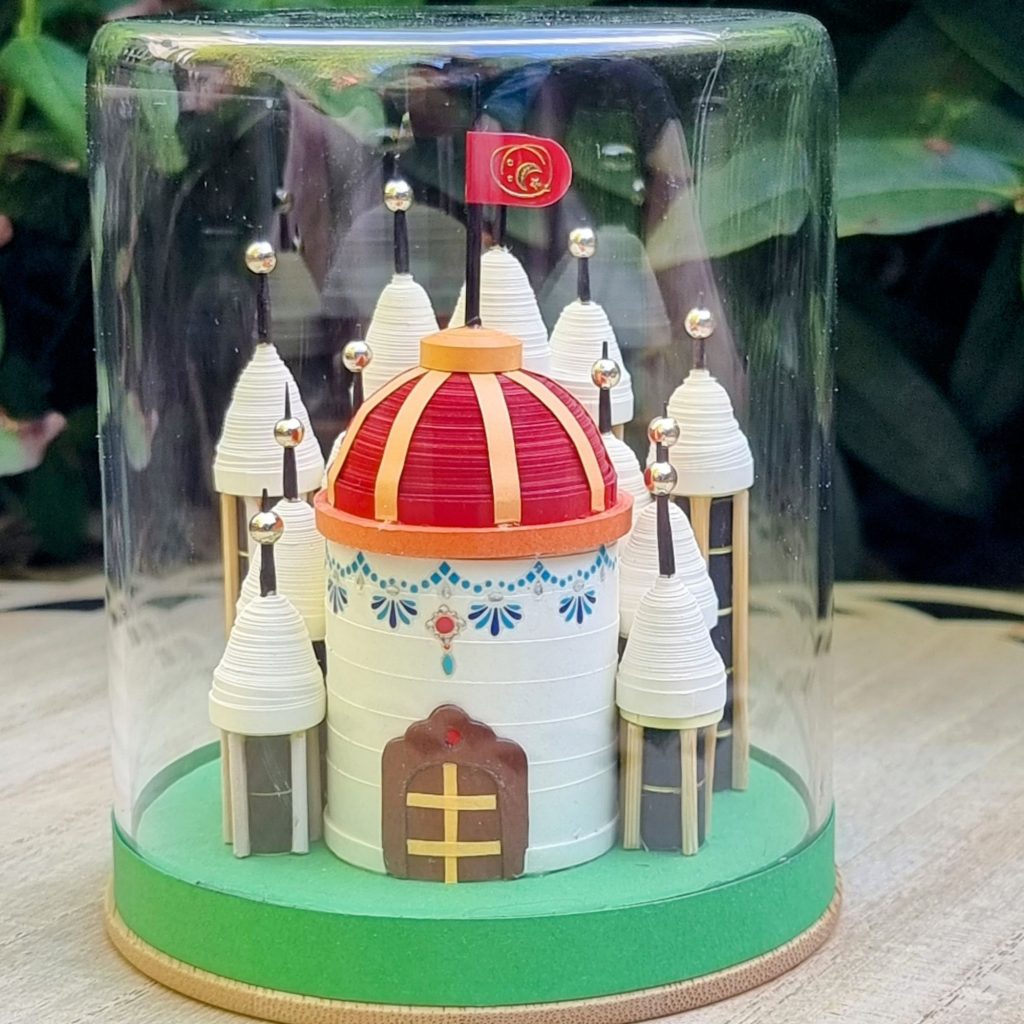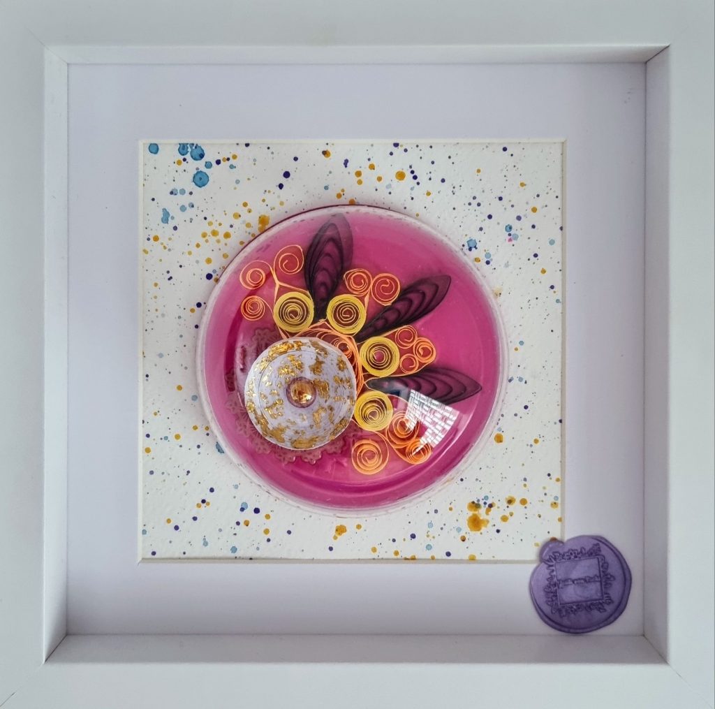 Hergestellt aus Acrylhalbkugel, Quillingpapierstreifen, Aquarellefarben, Holzleim, Blattgold
