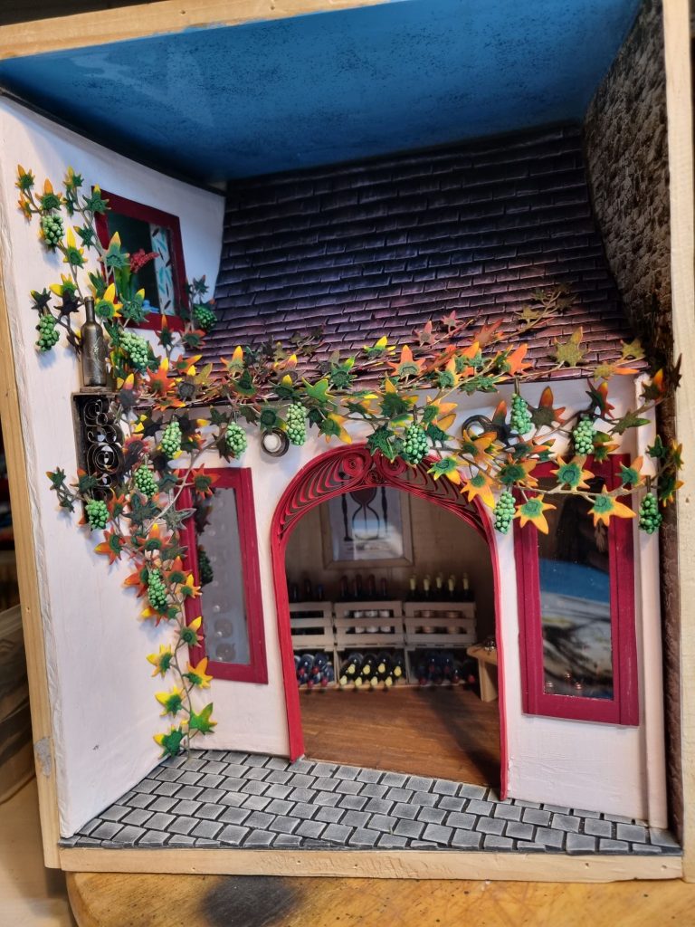 Hergestellt aus Pappe, Papier, Weinkisten, Styrodur, Holzleim, Puppenhaus-Flaschen 1:12, Draht, Alkoholtinte, Quillingpapierstreifen, Steinpapier, Acryl, Acrylfarbe, Klarlack, Kaffeerührstäbchen