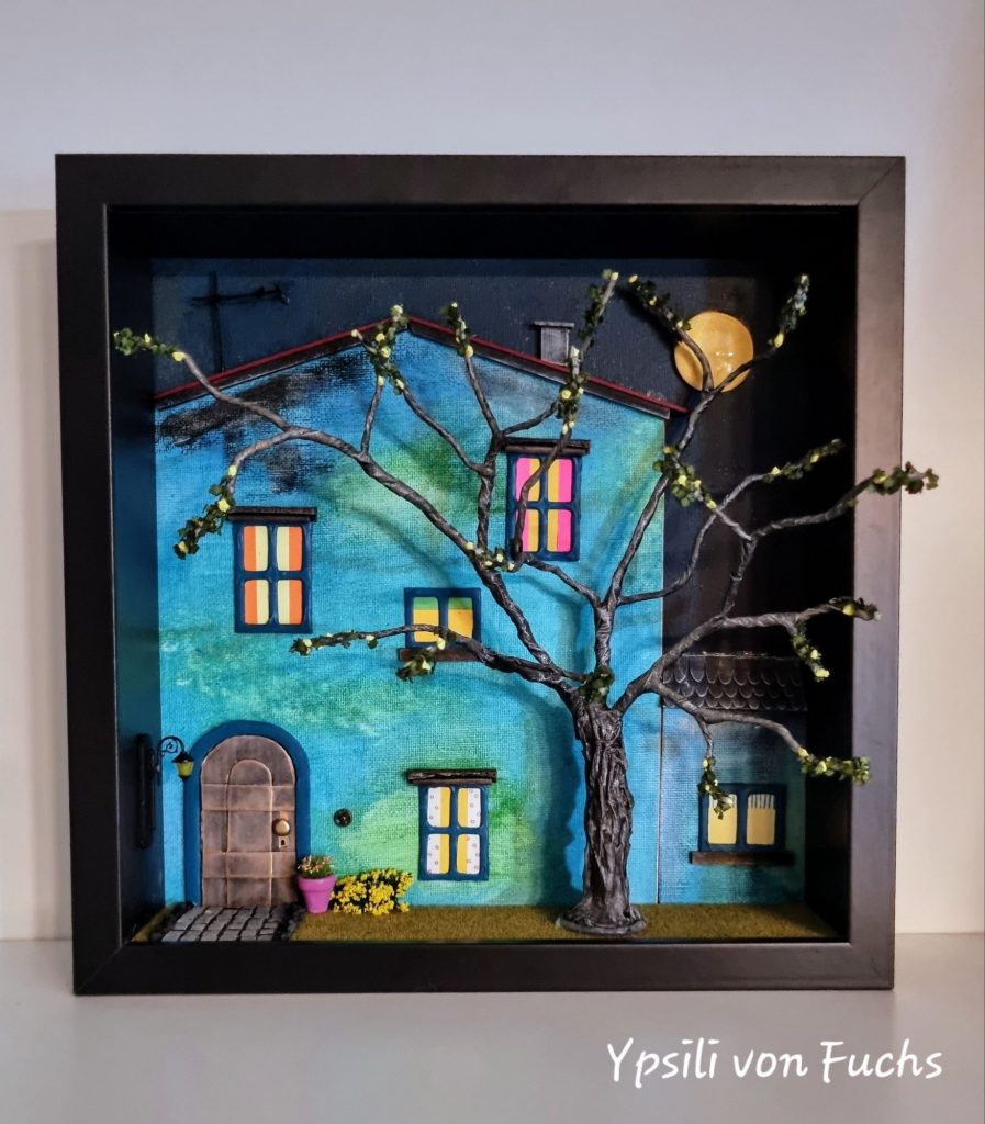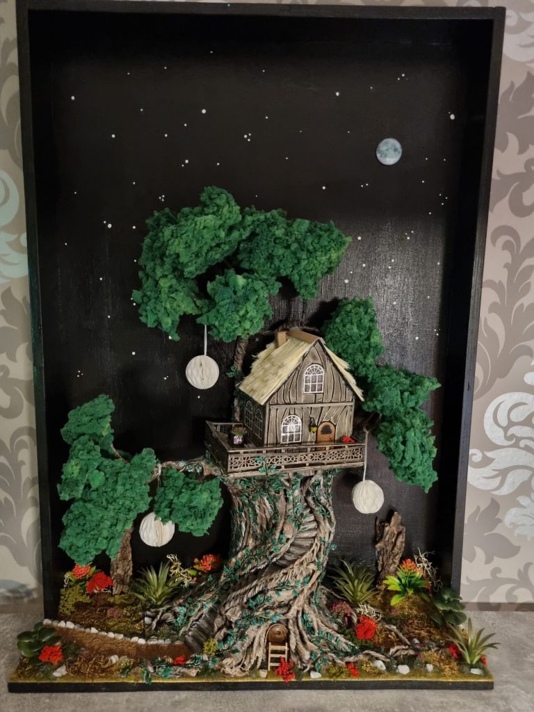 Hergestellt aus Pappe, Epoxidharz, Äste, Beflockung vom Modellbau, Draht, Styroporkugeln, Acrylfarben, Holzleim , kleine getrocknete Blumen, Glitzer, Styrodur, Pappmaché, Eisstiele, Haushaltsschwämme,Vinylfolie, medizinische Baumwolle, Paverpol, Gesso, Modellbau-Bäume, Moos, Deko-Stifte, Nägel, Holzperlen, Pailetten, Haarspray