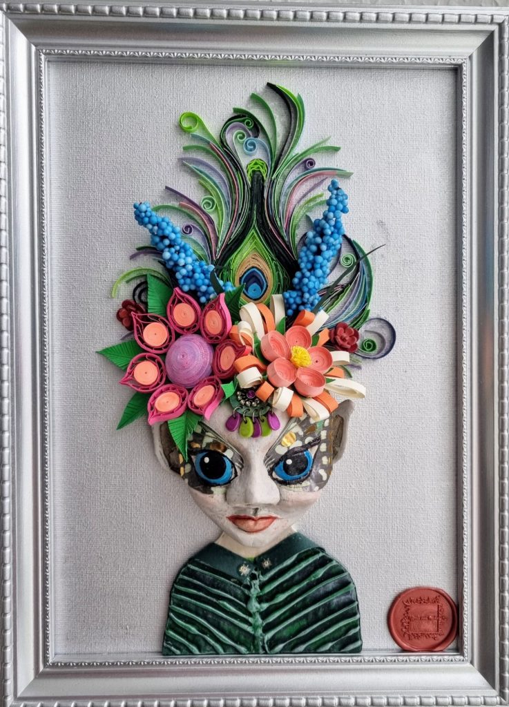 Hergestellt aus Draht, Pappmaché, Papier, Pappe, Quillingpapierstreifen, Acrylfarbe, Holzleim, Modelliermasse