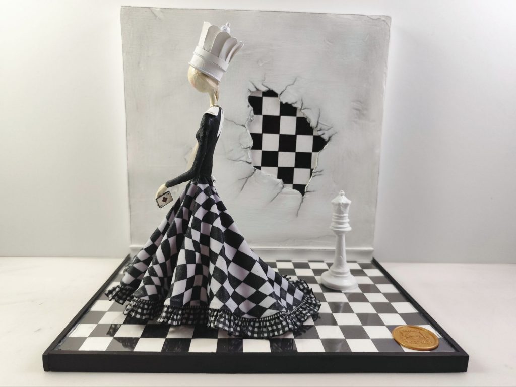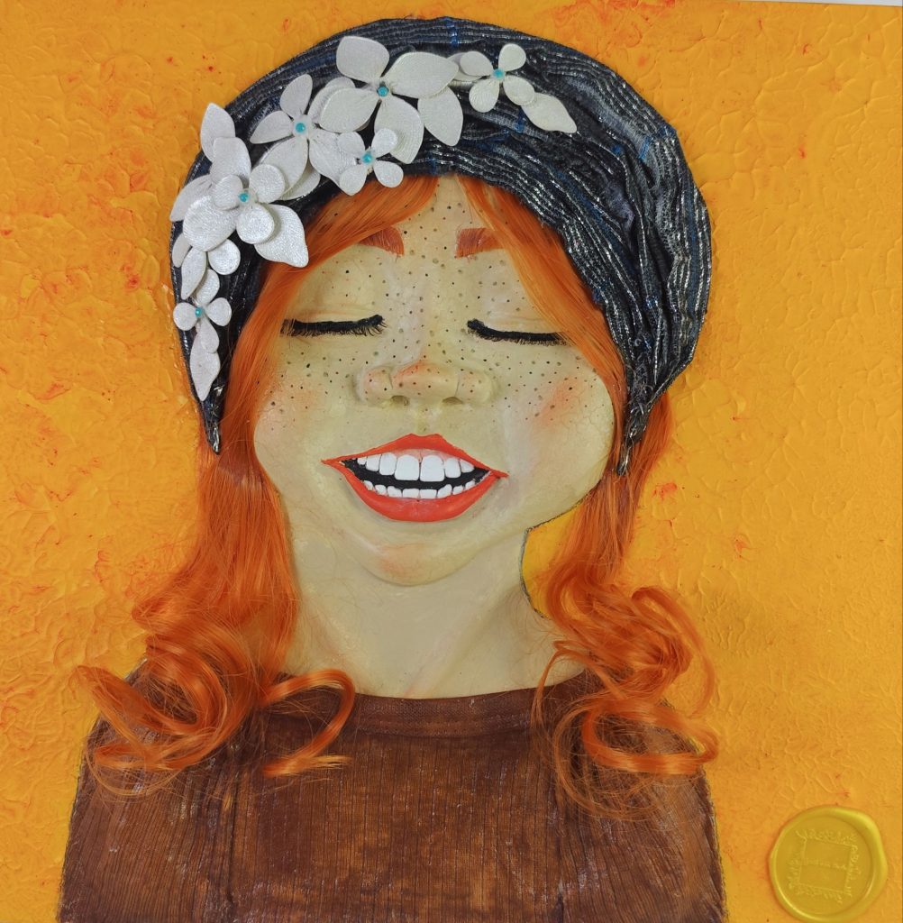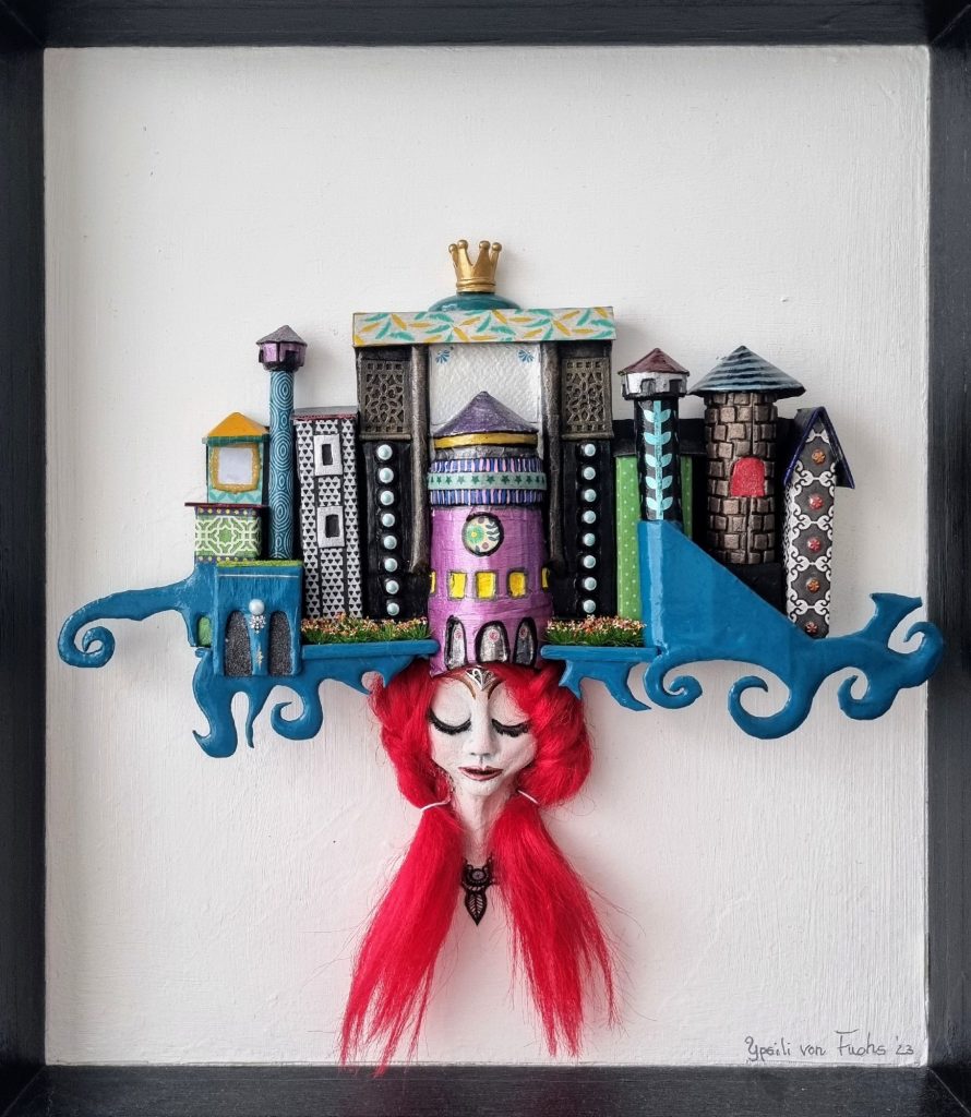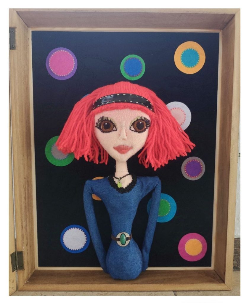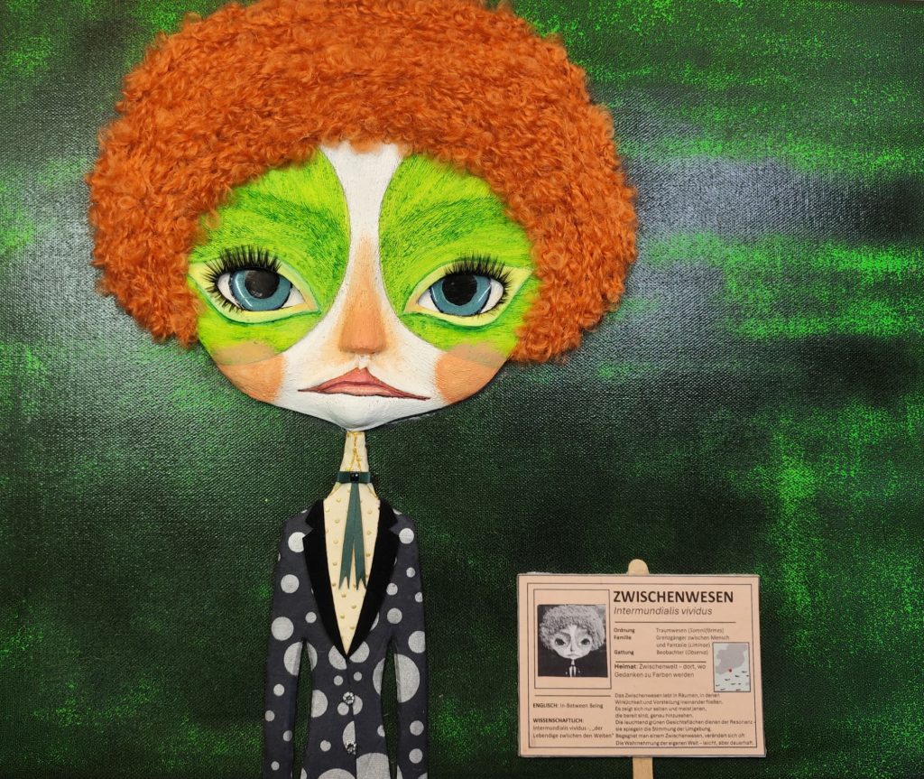 Hergestellt aus Schablonierfarbe, Gesso, Pappmaché, Pappe, Stoff, Draht, Strumpfhose, Perlen, Puppenwimpern, Puppenhaare, Klarlack, Paverpol, Acrylfarbe, Sommersprossenstifte