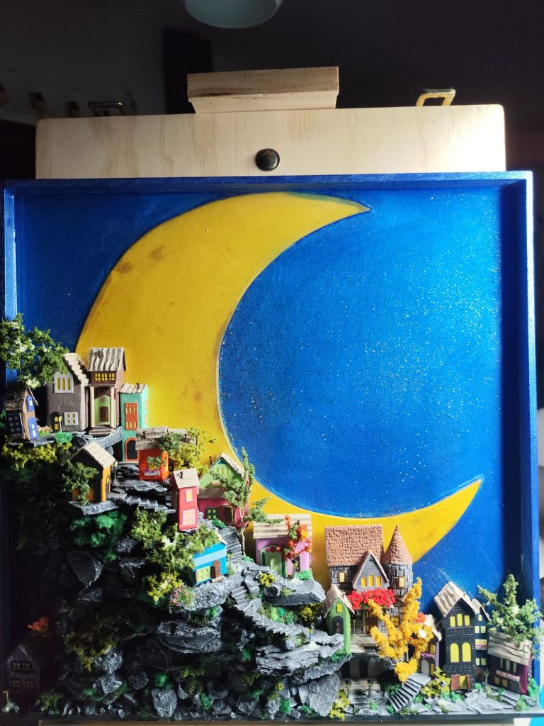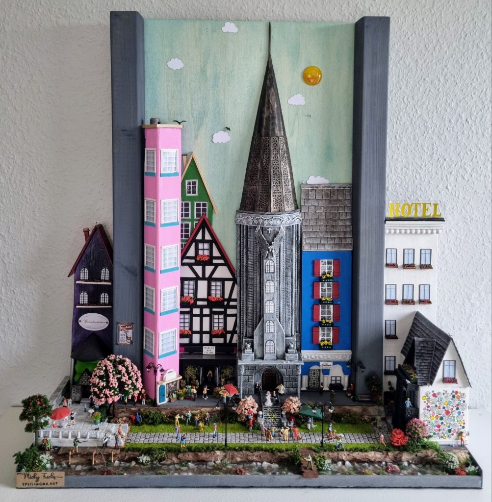 Hergestellt aus Pappe, Papier, Styrodur, kleine Steine, Beflockung vom Modellbau, Draht, Zahnstocher, Eisstiele, Perlen, Holzleim, Epoxidharz, Glitzer, Nägel, Acrylfarbe, Pailetten
