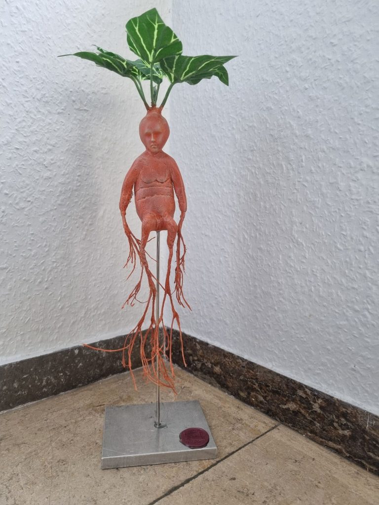 Hergestellt aus Draht, Metall, Juteseil, Modelliermasse, Acrylfarbe, Holzleim, Kunstpflanze
