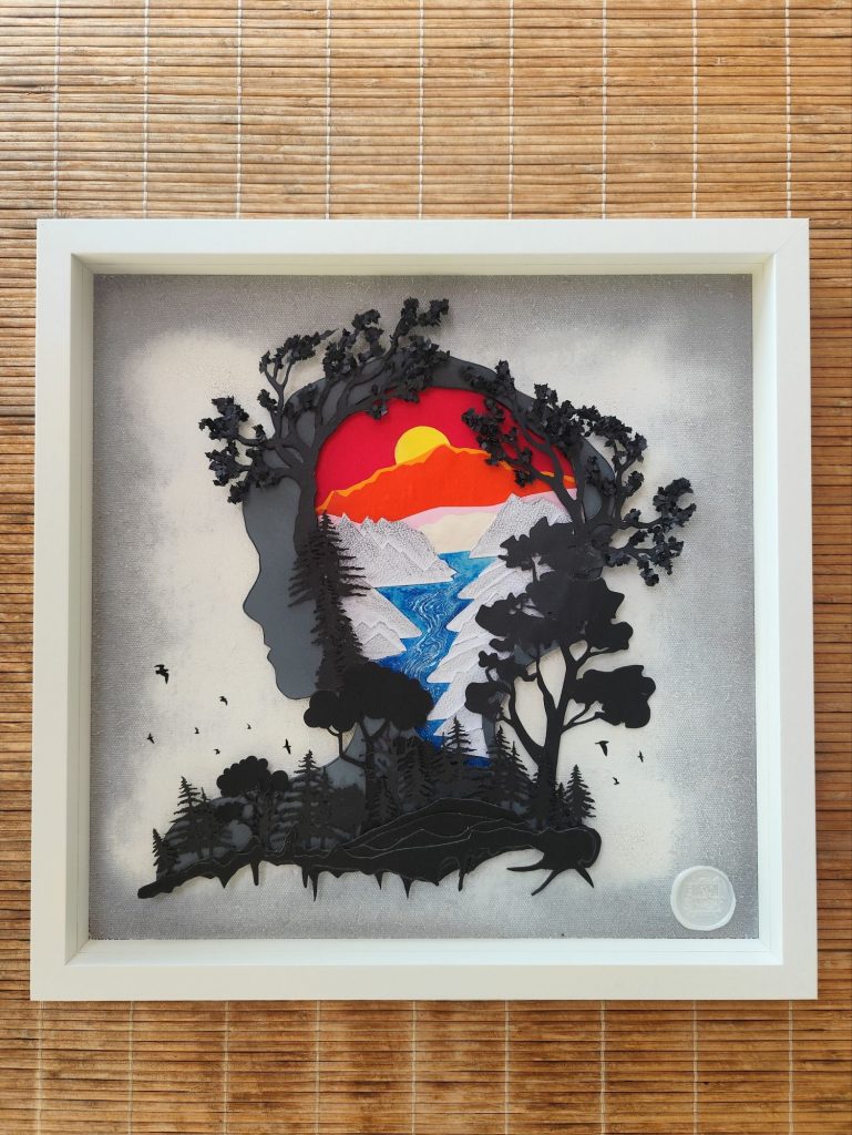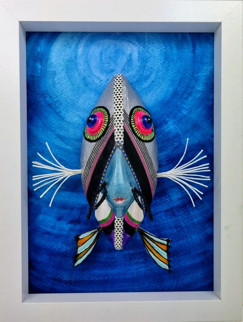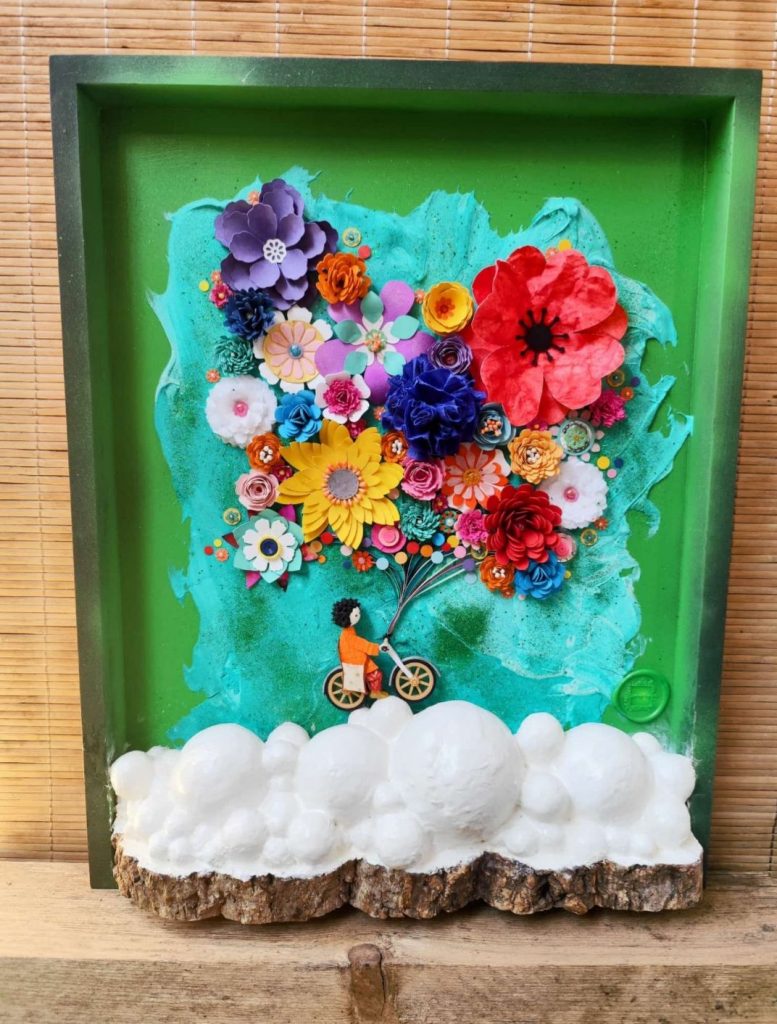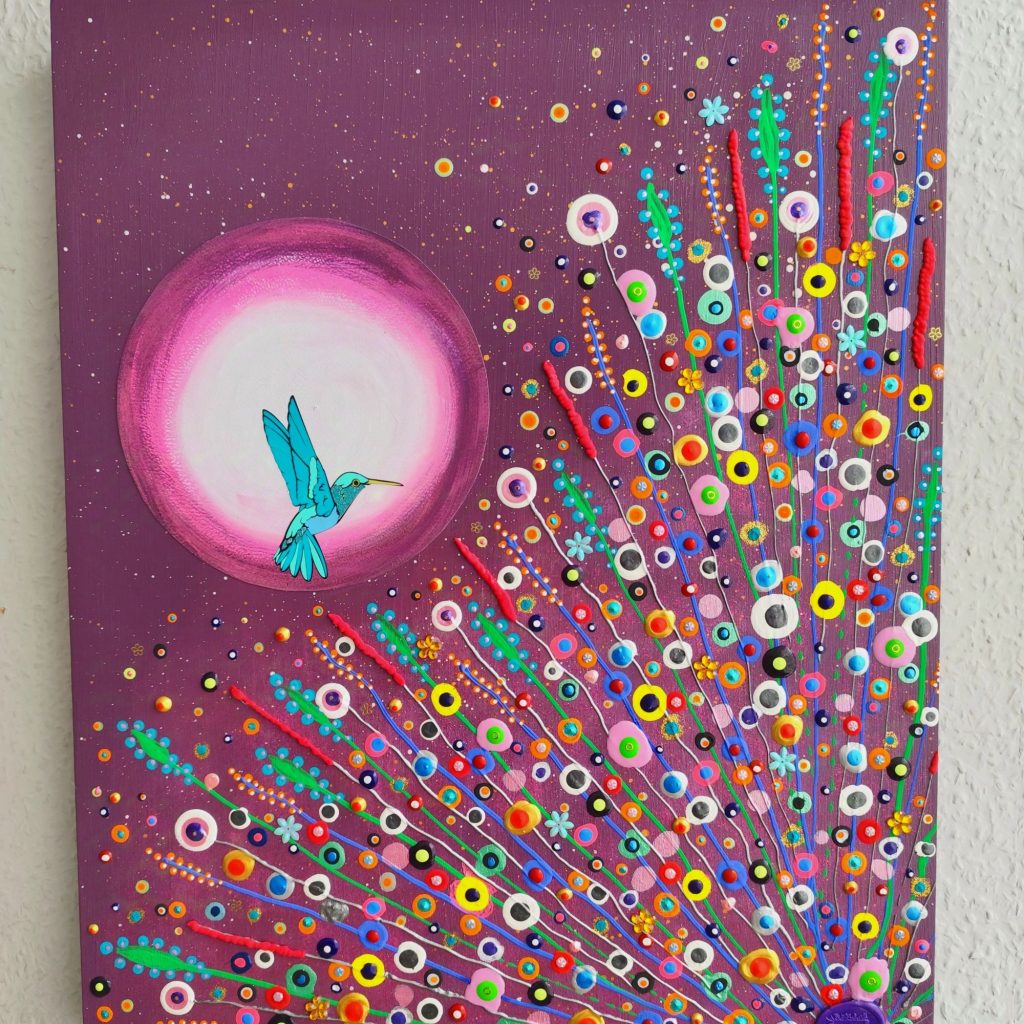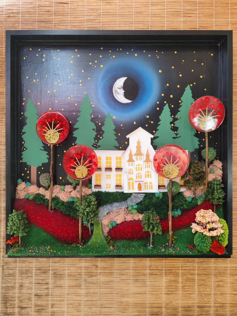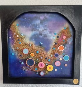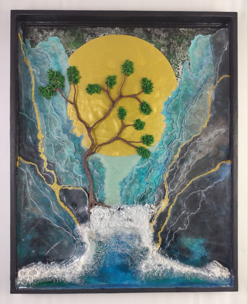 Hergestellt aus Aquarellpapier, Tinte, Spülschwämme, Acrylfarbe, Nachtleuchtende Farbe, Alkoholtinte, Epoxidharz, medizinische Baumwolle, Steine, Wassertextur, Goldglitzer, Leinwandstoff, Draht, Bastelleim