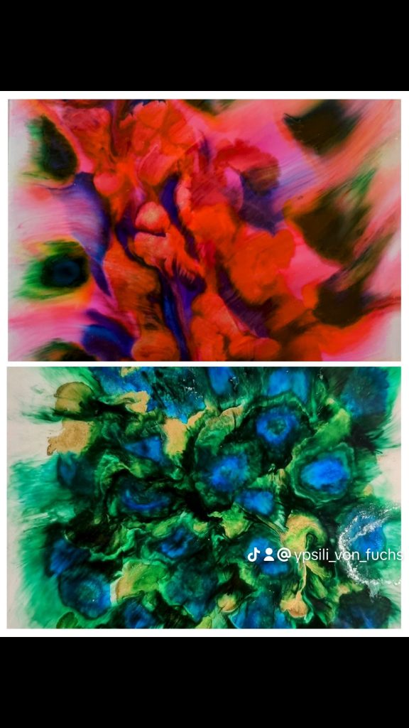 Hergestellt aus Acrylfarbe, Klarlack, Vinylfolie, verschiedenste Effektfarben wie zB. window colours, nachtleuchtende Farben, Perlenfarben oder Metallicfarben