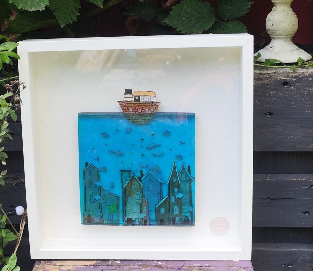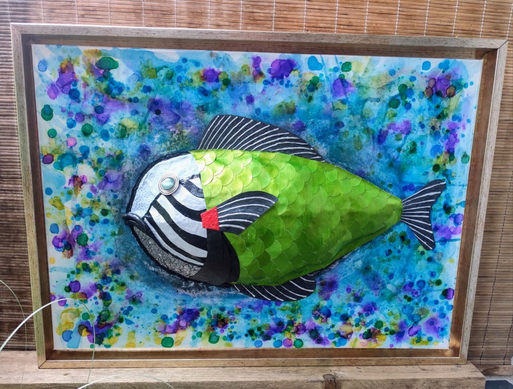 Hergestellt aus Pappe, Streudekor, Miniaturfische vom Modellbau, Epoxidharz, Alkoholtinte, Aquarellefarben, Holzleim