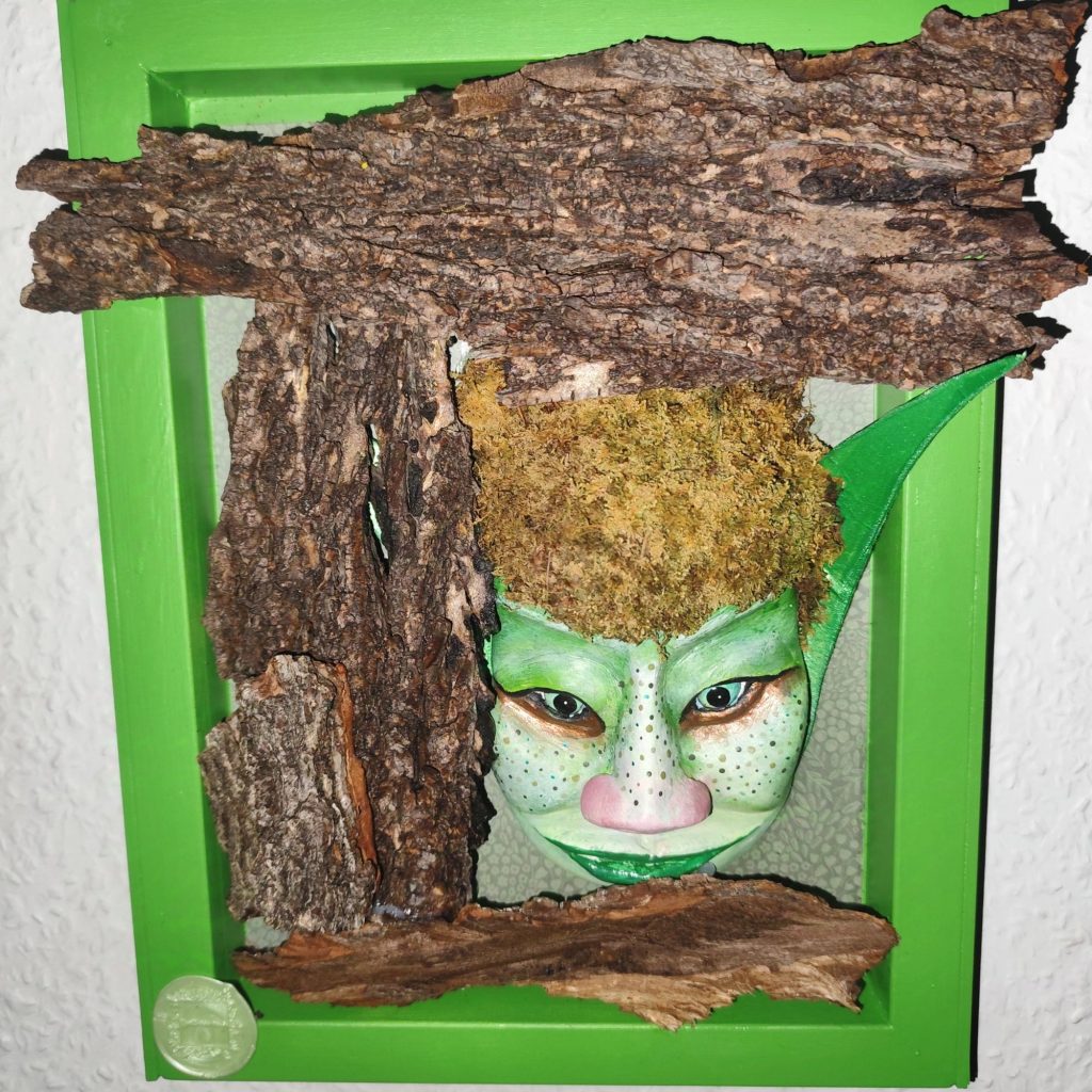 Hergestellt aus Modelliermasse, Pappe, Pappmaché, Holzleim, Moos getrocknet, Baumrinde, Epoxidharz, Acrylfarbe, Klarlack, Heißkleber