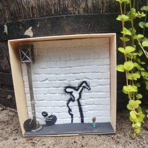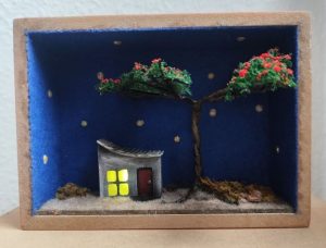 Hergestellt aus Pappe, Papier, Holzleim, Draht, Heißkleber, Druckknopf, Acrylfarbe, Streugras, Styrodur, Glasnugget