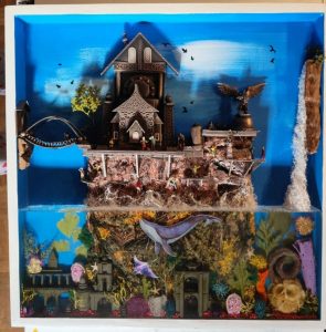 Hergestellt aus Epoxidharz, Styrodur, Trockenblumen, Naturdeko Teile, Pappe, Papier, Holzleim, Wassertextur aus dem Dioramabau, Baumwollewatte, Klarlack, Acrylfarbe, Modellbaufiguren, Holzstäbchen, Zahnstocher, Warhammer Figur, Holtfächer, Vinylfolie, Peddimgrohr, Draht, Beflockung aus Papier, getrocknete Seesterne, kleine Steine, Styropurkugeln