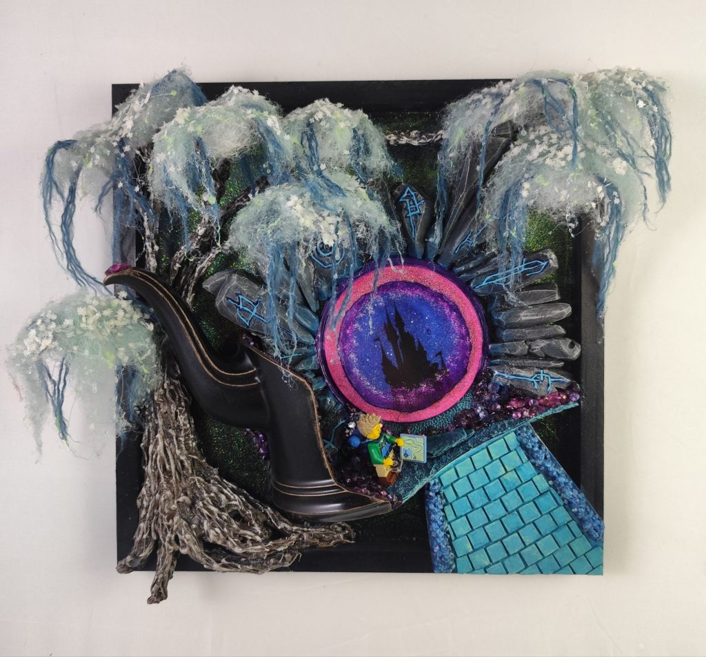 Hergestellt aus einer alten Teekanne, Draht, Heißkleber, Kreppband, Wolle, Filzwolle, Haarspray, Papier, Resin, , Styrodur, Gelfarbe, kleine Perlen und Kristalle, Bastelleim, Tinte, Streudekokristalle, Acrylfarbe, Gesso, Acrylscheibe, Vinylfolie, nachtleuchtende Farbe, Legofigur