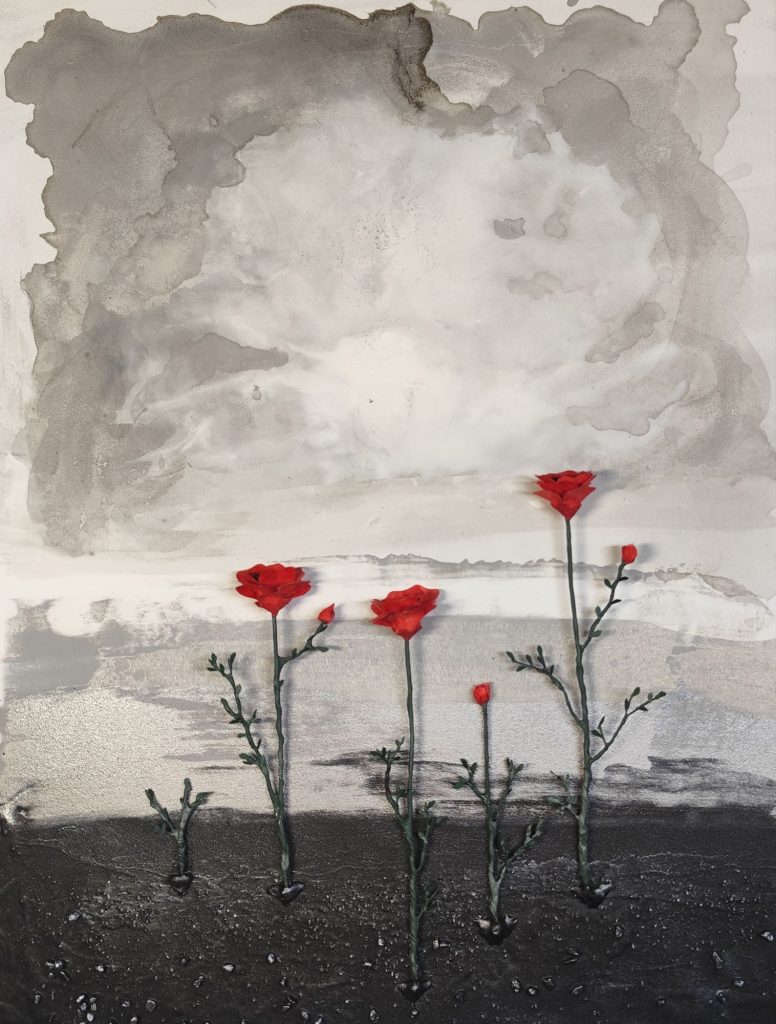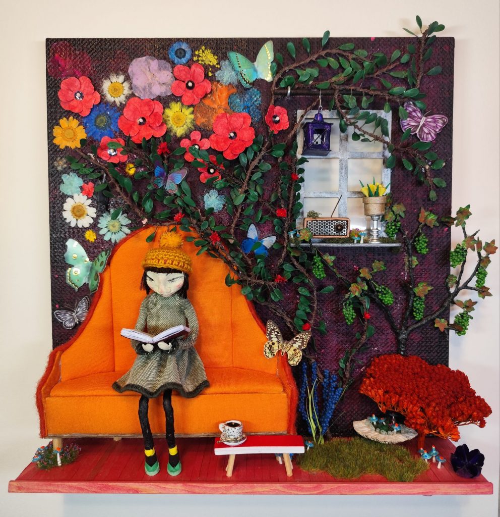 Hergestellt aus Acrylfarbe, Tinte, Papier, Fineliner, Aquarellefarben, Bastelleim, Draht, Wasserstrukturpaste, Beflockung und Gras für Modellbau, Eishütchen, Blobbfarbe